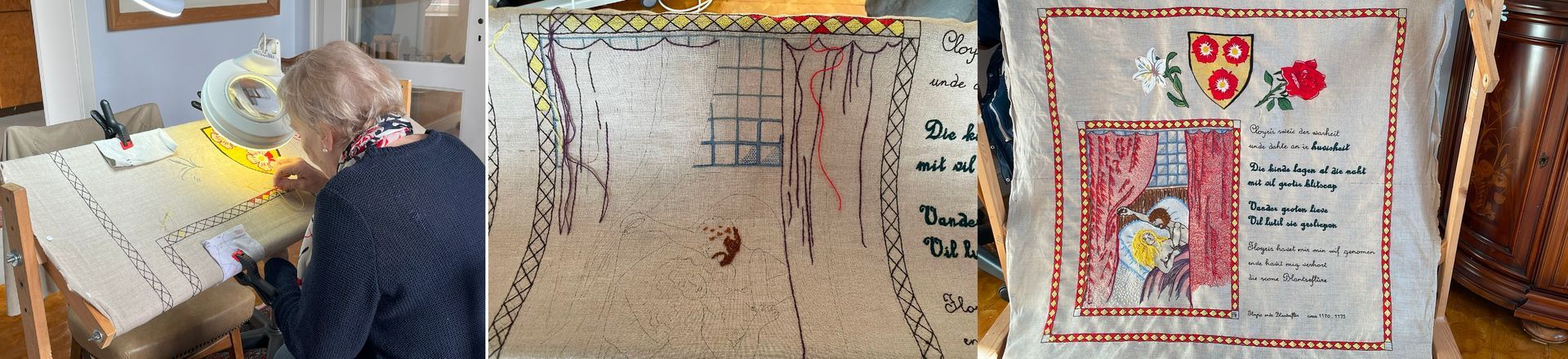 Eine mittelalterliche Liebesgeschichte wurde von zahlreichen Stickerinnen in ganz Europa auf einem 100 m langen Wandteppich veranschaulicht. Das hier gefertigte Teilstück ist nach fast einem Jahr Arbeit nun fertig und