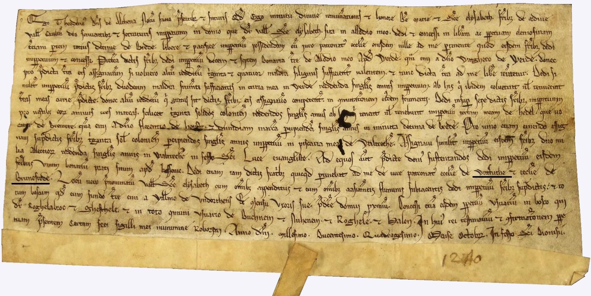 Dirk III., Herr von Altena, schenkt den Cauliten von Sint-Elisabethsdal in Nunhem den dritten Teil des Zehntels von Maasbree mit der Schirmherrschaft über die dortige Kirche, siebzehn Bunderland in Stevensweert, eine jährliche Strafe von zwölf Malder-körnern, einen Jahreszins von dreißig Schilling Kölner aus seinem Land in Heel und eine halbe Mark aus dem kleinen Zehntel von Maasbree für Kleidung, eine jährliche Beteiligung von 30 Schillingen Köln aus dem Fischereirecht in Woudrichem für den Kauf von Wein und dort 2000 Heringe, eine Bunkerwiese in Kessenich für den Unterhalt der Pferde und seinen Anteil an den Patronatsrechten der Kirchen von Watfuthe (Waldfeucht) und Brunesrode (Braunsrath). Gleichzeitig weist er den Kauliten das St. Elisabethtal mit all seinen Anhängen sowie den gesamten Wald in der Nähe zu und gibt ihnen den Nießbrauch der Wälder von Roghelabroc und Ghesthele sowie in den Gemeindeländern Buggenum, Nunhem, Roggel und Haelen3)