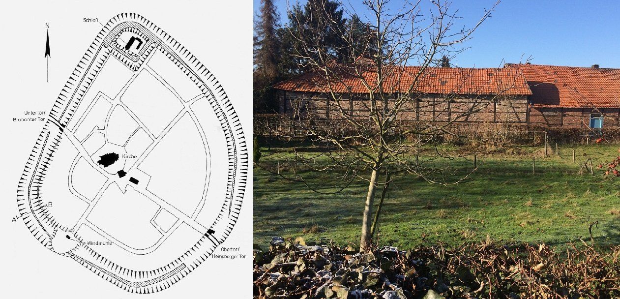 1341 erhielt eine Schwiegertochter von Dietrich II. von Heinsberg die Herrschaft Waldfeucht. Im Jahr 1363 kommt diese zusammen mit Gangelt und Millen als Pfand an den Herzog Eduard von Geldern, der alle drei 1364 an den Grafen Johann von Moers weiterverpfändete. Die Grafen von Moers verkauften Waldfeucht 1378 an Herzog Wenzel von Brabant. 1) Er begann umgehend mit der (Neu) Errichtung der Stadtbefestigung. Die Burg, die wahrscheinlich als Adelssitz aus einer hochmittelalterlichen Niederungsburg oder Motte entstand, wurde dabei in die Umwallung einbezogen. Die Anlage bildet zugleich den nördlichsten Bereich der Stadtbefestigung (Abb. 1). Schaut man sich den Waldfeuchter Grundriss an, deutet dieser auf eine ältere Entstehung der Burg: Die ansonsten kreisförmige Umwallung läuft an der Burg nahezu spitzwinklig zusammen. Bei einer gleichzeitigen Errichtung wäre dies wohl anders gelöst worden. Zusätzlich zum Wassergraben sicherte man die Wälle mit Dornenhecken. Zudem sollten die Anlieger der Wallparzellen ihre Scheunen und Ställe bis an den inneren Wallweg bauen, wodurch deren Wandfront einer Stadtmauer glich (Abb. 2).